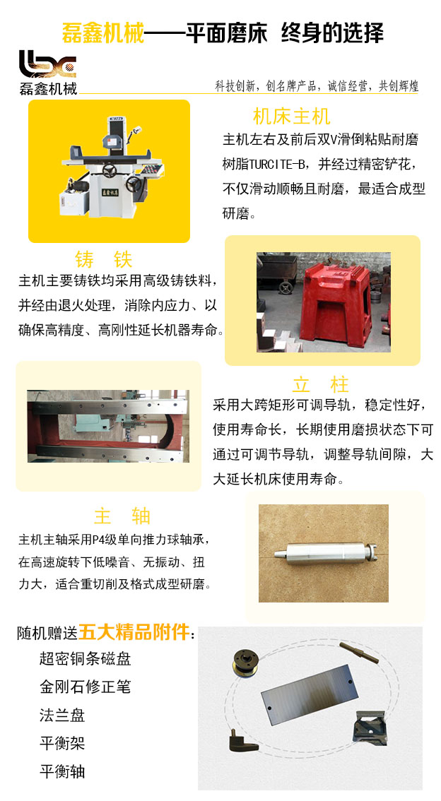 本機床可磨削各種平面和復雜成型面,適用于不需要機動進刀的磨削加工,主軸采用P4級精密滾動軸承、迷宮密封,防水防塵性能好,運動平穩、精度高。縱向采用滾珠鋼導軌,操作輕便靈活,立柱采用大跨距形導軌,鋼性好,穩定性高。整機采用手動油泵集中潤滑。